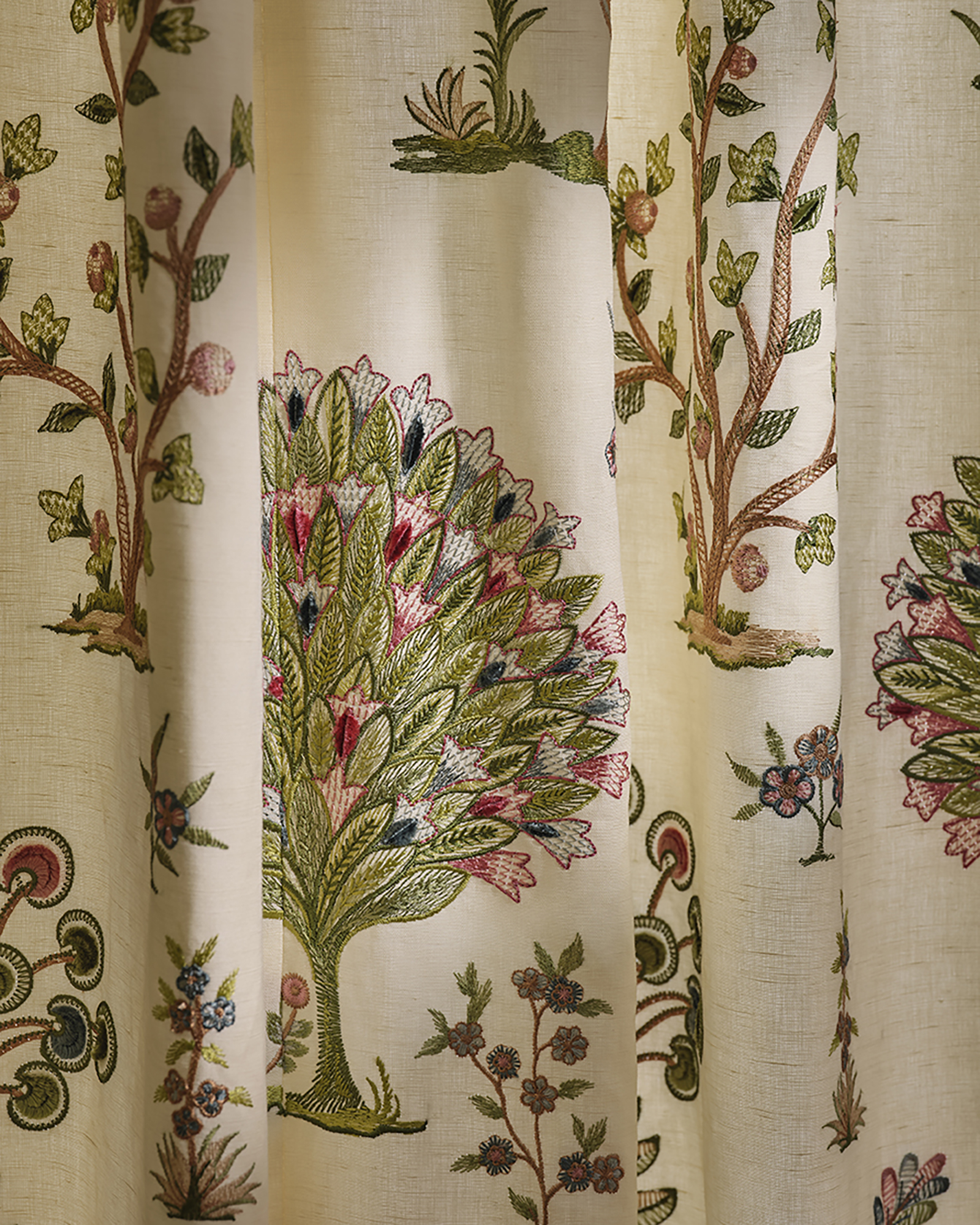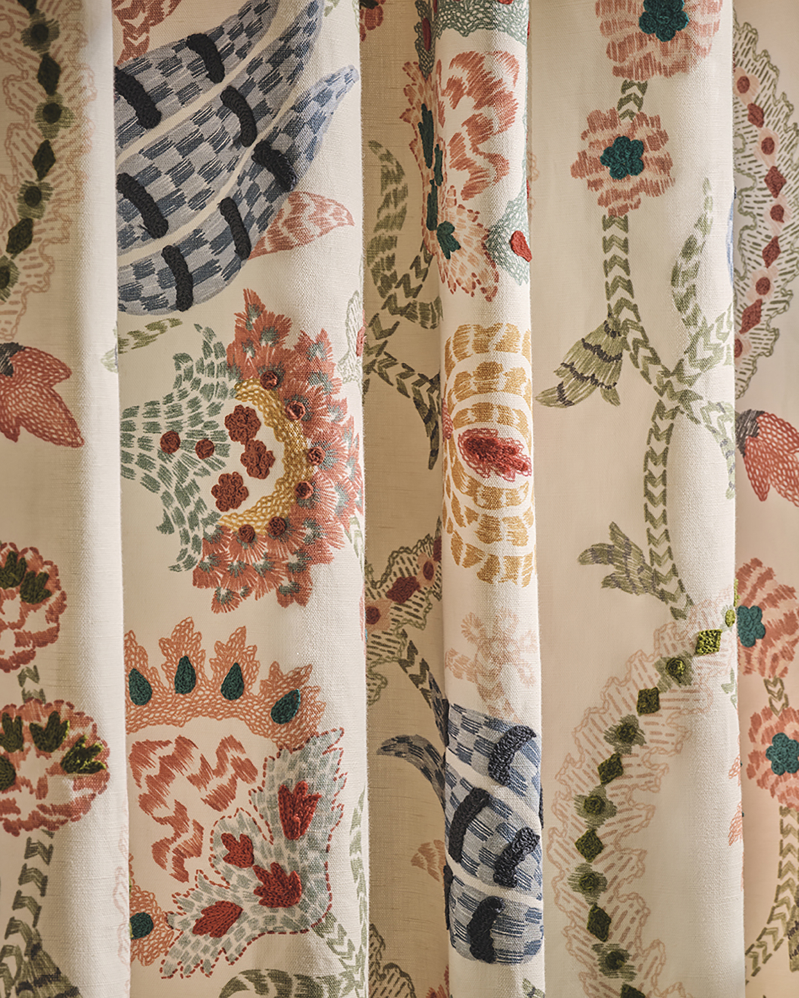 Soft embroidered Linens and printed fabrics with an Asian influence. Curtain and upholstery fabrics are available in this collection, blending beautifully to give a well conceived look to your interior. Colour tones are rich and earthy, Autumn tones mix with cool duck eggs and teal. Take a look at the images below.