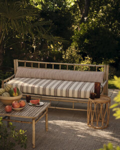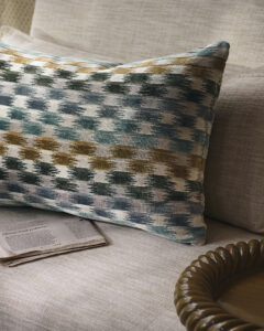 Designs are of a bygone era, palm trees, Bamboo, Big blousy roses and toile, teamed with Aztec block prints, and plain textured velvets.